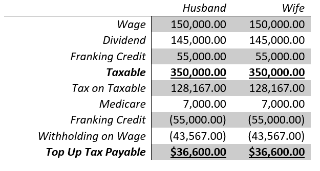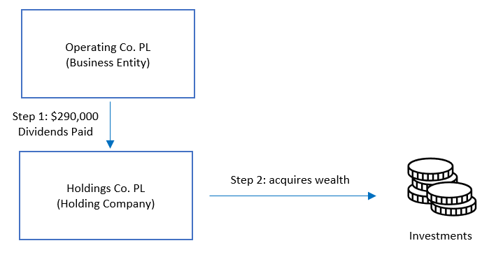 For example, let’s assume on a conservative basis that there is $290,000 worth of retained earnings in the operating company. This would be extracted by paying a fully franked dividend equal to the wealth in the company ($290,000).